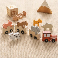 かわいい動物モチーフの木製つみきトレイン。電車遊びと積み木遊び、どちらも楽しめる知育玩具です。