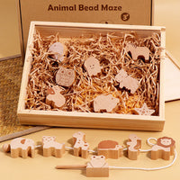 かわいい動物モチーフの木製ひも通しおもちゃセットです。ブロックをひもに通したり並べたりして、手先の器用さや集中力を育てられます。