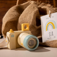 のぞくたびに模様がくるくる変わる“万華鏡レンズ”付きの木製おもちゃカメラ。見て・押して・構える動作で遊びが広がり、想像力と指先の動きをやさしく育みます。インテリアになじむナチュラルカラーで、ギフトにもおすすめ。