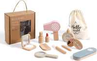 筆やコンパクトを並べて「今日のメイクはどれにする?」。塗る・開ける・しまうの動作を楽しみながら、指先の巧緻性と想像力を育む木製のメイクごっこセットです。やさしい色合いでお部屋にもなじみ、ギフトにも喜ばれます。